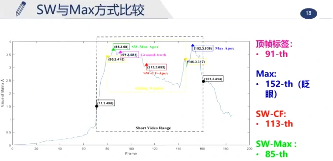 这个长视频大约持续200帧,真实的峰值帧约为第91帧,最大值检测为第152帧(但实际这一帧在眨眼),使用滑动窗更准确,更能排除其他的运动干扰