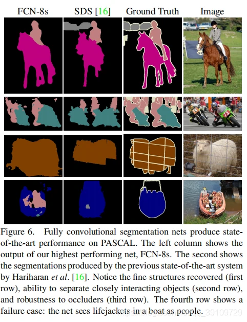 可以看到本文提出的 FCN-8s 模型在常用的 mean IU 指标上有着较大的提升,同时也大幅度降低了模型的推理时间。图 6 显示了 FCN-8s 模型与 SDS 语义分割的效果: