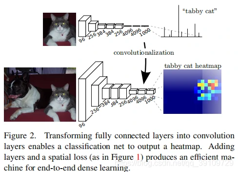 典型的识别网络、包括 LeNet、AlexNet 以及更深的卷积模型都是接受固定大小的输入,得到非空间的输出。因为全连接层的存在使得这些网路丢弃了特征图的空间信息。然而,全连接层也可以看成是一种特殊的卷积层,相当于这些“卷积层”的卷积核覆盖整个特征空间。所以可以将 FC 层转化为 Conv 层使得它们可以接受任意尺寸的输入、并输出对每个像素的分类结果。这种转换如 Fig02 所示: