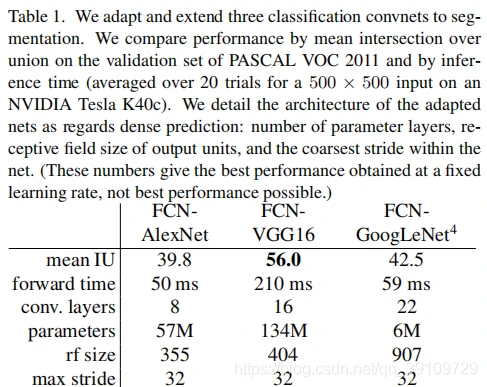 作者首先选用了在大规模图像分类上被证明有较好性能的 AlexNet、VGG-16 以及 GoogleNet 作为改进目标,在 GoogleNet 中仅使用最后一个 loss layer(去除辅助分类器),同时抛弃了最后的平均池化层以提高性能。对于所有的 CNN 模型,将最后的 FC 层都转换为 Conv 层。同时对所有的上采样输出进行通道数为 21(classess + background)的 1 x 1 卷积进行密集预测。表 1 是三个改进模型在 PASCAL VOC2011 数据集上的表现: