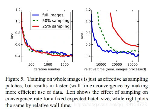 Patch Sampling 同时,作者还进行了 patch-wise training 的对比试验。之前的文献表明,patch-wise 的训练中由于进行随机采样,数据的方差较大,这有利于加速模型收敛。(???)在研究这种 trade-off 的过程中,作者通过空间上的损失采样来进行,同时为每种训练方式(full image training VS patch-wise training)独立地选定一个概率 p,以这个概率保留掉最后一层的神经元,同时为每个 batch 中的图像数量乘上一个因子 1/p(0 < p < 1)以扩大 batch_size。对比实验结果如图 5 所示: