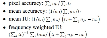 - mean IU 平均交并比,将每个类别的正确预测像素数量 n_ii 除以本类别像素数量 t_i 除以本类别像素数量 i