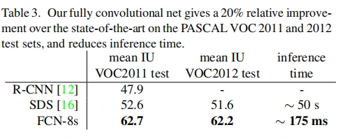 下面的表 3 显示了 FCN-8s 模型与之前的 SOTA 模型 SDS 以及 R-CNN 在 PASCAL VOC 2011、2012 数据集上的性能比较: