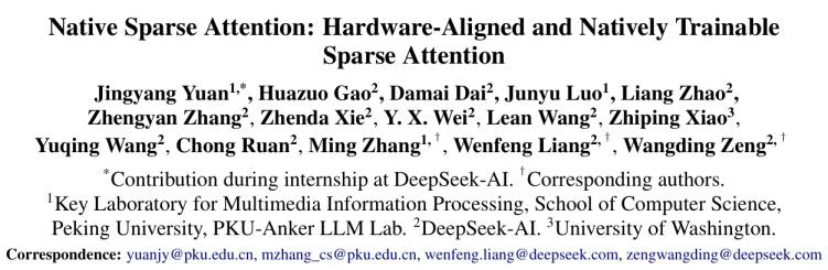 该论文发表于计算机语言学顶级会议 Association for Computational Linguistics (ACL) 2025年主会长文 (CCF-A)并荣获 ACL 2025会议最佳论文奖,题目为 《Native Sparse Attention: Hardware-Aligned and Natively Trainable Sparse Attention》。
