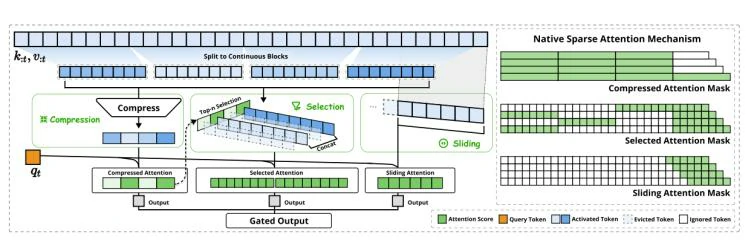 NSA的整体框架将输入的键(key)和值(value)组织成时间块(temporal blocks),并通过三个并行的注意力分支进行处理:压缩的粗粒度token (compressed coarse-grained tokens)、选择性保留的细粒度token (selectively retained fine-grained tokens) 和 滑动窗口 (sliding windows)。最终,各分支的输出通过一个学习到的门控机制进行聚合。为了最大化实际效率,该框架还配备了专门设计的计算内核(Kernel)。