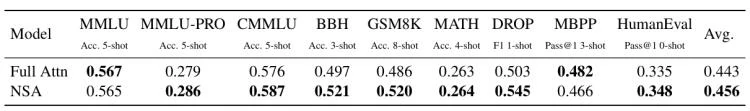 内容解读:该表比较了NSA与全注意力基线在9个通用基准上的表现,涵盖知识(MMLU)、推理(GSM8K, MATH)和代码(HumanEval)等多个方面。