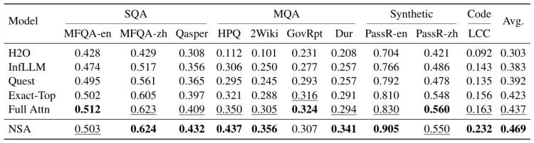 内容解读:该表在LongBench基准上将NSA与包括H2O、InfLLM、Quest在内的多种SOTA稀疏方法及全注意力模型进行对比。为保证公平,所有稀疏方法的token激活数量被设定为相同水平。