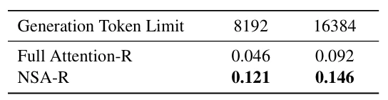 核心发现:在8k和16k两种生成长度限制下,NSA-R的准确率均显著高于Full Attention-R(分别高出7.5%和5.4%)。“这些结果验证了预训练的稀疏注意力能够有效捕捉对复杂数学推导至关重要的长距离逻辑依赖 (These results validate the pretrained sparse attention enable efficient capture of long-range logical dependencies)”。