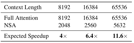 解码速度 (表4):解码过程是内存带宽受限的。NSA通过将64k序列的KV缓存加载量从65536个token锐减至5632个,实现了高达11.6倍的理论解码加速。