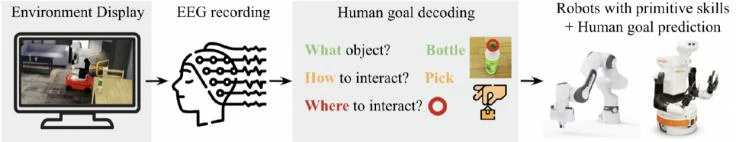NOIR 由两个部件组成,一个用于从人脑信号解码目标的模块化管道,以及一个具有原始技能库的机器人系统。机器人具有学习预测人类预期目标的能力,从而减少了解码所需的人力。