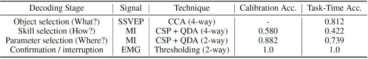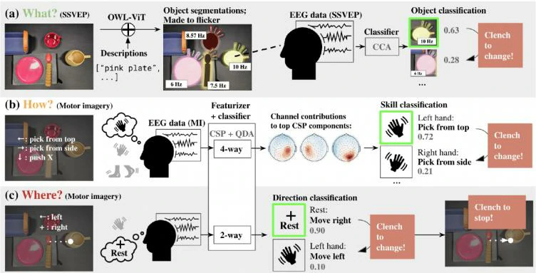 用于从 EEG 信号解码人类预期目标的模块化管道:(a) 使用 CCA 分类器从 SSVEP 信号解码要操纵的对象;(b) 如何与物体交互,使用 CSP+QDA 算法从 MI 信号解码; (c) 在何处交互,从 MI 信号解码。使用捕捉下颌咬紧时的肌肉张力的安全机制来确认或拒绝解码结果。