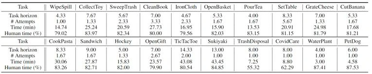 从BEHAVIOR benchmark和Activities of Daily Living中选择任务来捕捉人类的实际需求。由16个桌面任务和4个移动操作任务组成。这些任务涵盖多种类别,包括八项备餐任务、六项清洁任务、三项个人护理任务和三项娱乐任务。