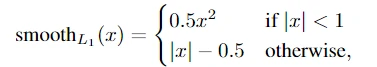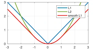 即平滑的L1损失(SLL),出自**Fast RCNN[2]**。SLL通过综合L1和L2损失的优点,在0点处附近采用了L2损失中的平方函数,解决了L1损失在0点处梯度不可导的问题,使其更加平滑易于收敛。此外,在|x|>1的区间上,它又采用了L1损失中的线性函数,使得梯度能够快速下降。