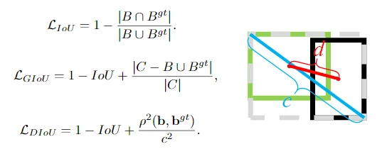 图左给出这三个IoU损失所对应的计算公式。对于DIoU来说,如图右所示,其惩罚项由两部分构成:分子为目标框和预测框中心点之间的欧式距离;分母为两个框最小外接矩形框的两个对角线距离。因此, 直接优化两个点之间的距离会使得模型收敛得更快,同时又能够在两个边框不重叠的情况下给出一个优化的方向。