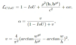 CIoU的计算公式如下所示,可以看出,其在DIoU的基础上加多了一个惩罚项αv。其中α为权重为正数的重叠面积平衡因子,在回归中被赋与更高的优先级,特别是在两个边框不重叠的情况下;而v则用于测量宽高比的一致性。