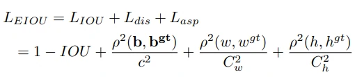 F-EIou loss首先提出了一种有效的交并集(IOU)损失,它可以准确地测量边界框回归中的重叠面积、中心点和边长三个几何因素的差异: