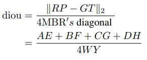 文章首先提出了一种对于Region Propasl(RP)和Ground Truth(GT)之间的新评估方式,即CDIoU。可以发现,它虽然没有直接中心点距离和长宽比,但最终的计算结果是有反应出RP和GT的差异。计算公式如下: