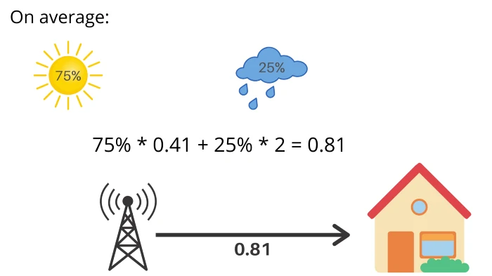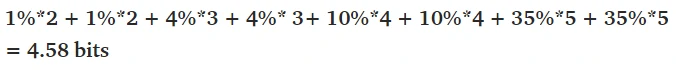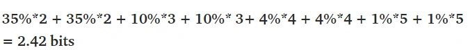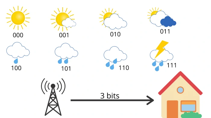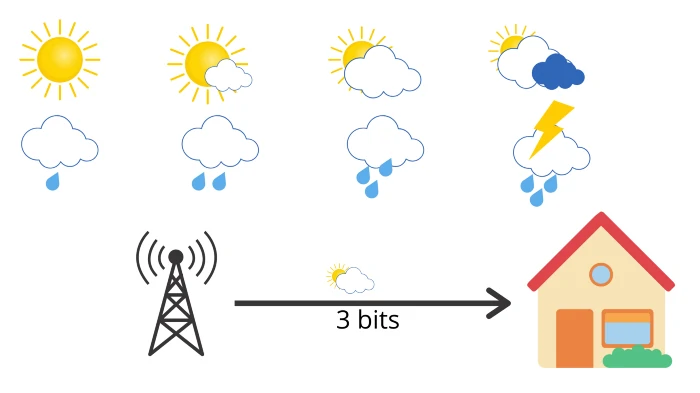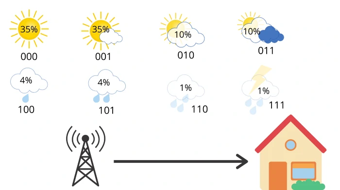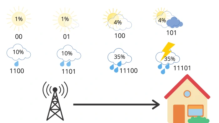 现在,我们只使用2位用于表示晴天或部分晴天,使用3位用于多云和大部分多云,使用4位用于表示中雨和小雨,使用5位用于大雨和雷暴。天气的编码方式是明确的,并且如果你链接多条消息,则只有一种方法可以解释位的顺序。例如,01100只能表示部分晴天(01),然后是小雨(100)。因此,如果我们计算该站每天发送的平均比特数,则可以得出,