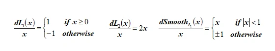 通过对这三个损失函数进行求导可以发现,L1损失的导数为常数,如果不及时调整学习率,那么当值过小时,会导致模型很难收敛到一个较高的精度,而是趋向于一个固定值附近波动。反过来,对于L2损失来说,由于在训练初期值较大时,其导数值也会相应较大,导致训练不稳定。最后,可以发现Smooth L1在训练初期输入数值较大时能够较为稳定在某一个数值,而在后期趋向于收敛时也能够加速梯度的回传,很好的解决了前面两者所存在的问题。