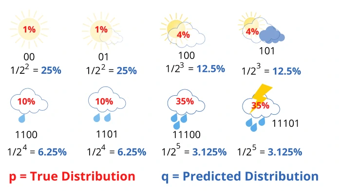 现在,让我们讨论一下交叉熵。它只是平均信息长度。考虑同样的例子,8种可能的天气条件,所有都是等可能的,每一种都可以用3位编码 [2^3=8]。