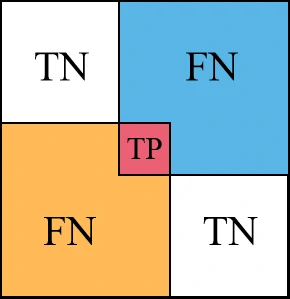 其中,|X∩Y|表示X和Y之间的交集,|X|和|Y|分别表示集合X和Y中像素点的个数,分子乘于2保证域值范围在0~1之间,因为分母相加时会计算多一次重叠区间,如下图: