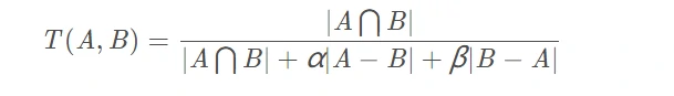 Tversky loss,发表于CVPR 2018上的一篇《Tversky loss function for image segmentation using 3D fully convolutional deep networks》[10]文章,是根据Tversky 等人于1997年发表的《Features of Similarity》文章[11] 所提出的Tversky指数所改造的。Tversky系数主要用于描述两个特征(集合)之间的相似度,其定义如下: