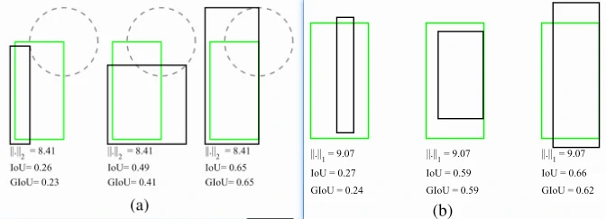即泛化的IoU损失,全称为Generalized Intersection over Union,由斯坦福学者于CVPR2019年发表的这篇论文[4]中首次提出。上面我们提到了IoU损失可以解决边界框坐标之间相互独立的问题,考虑这样一种情况,当预测框与真实框之间没有任何重叠时,两个边框的交集(分子)为0,此时IoU损失为0,因此IoU无法算出两者之间的距离(重叠度)。另一方面,由于IoU损失为零,意味着梯度无法有效地反向传播和更新,即出现梯度消失的现象,致使网络无法给出一个优化的方向。此外,如下图所示,IoU对不同方向的边框对齐也是一脸懵逼的,所计算出来的值都一样。