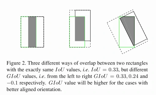 GIoU具有IoU所拥有的一切特性,如对称性,三角不等式等。GIoU ≤ IoU,特别地,0 ≤ IoU(A, B) ≤ -1, 而0 ≤ GIoU(A, B) ≤ -1;当两个边框的完全重叠时,此时GIoU = IoU = 1. 而当 |AUB| 与 最小闭合凸面C 的比值趋近为0时,即两个边框不相交的情况下,此时GIoU将渐渐收敛至 -1. 同样地,我们也可以通过一定的方式去计算出两个矩形框之间的GIoU损失,具体计算步骤也非常简单,详情参考原论文。