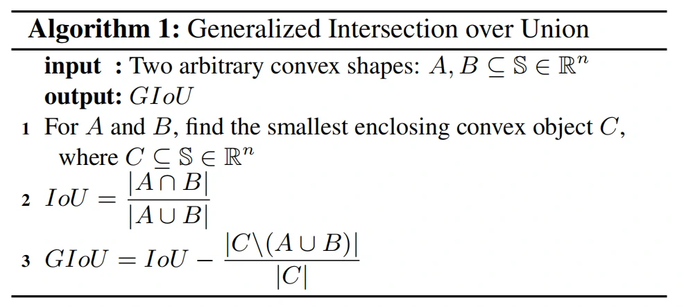 为了解决以上的问题,如下图公式所示,GIoU通过计算任意两个形状(这里以矩形框为例)A和B的一个最小闭合凸面C,然后再计算C中排除掉A和B后的面积占C原始面积的比值,最后再用原始的IoU减去这个比值得到泛化后的IoU值。