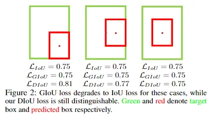 即距离IoU损失,全称为Distance-IoU loss,由天津大学数学学院研究人员于AAAI2020所发表的这篇论文[5]中首次提出。上面我们谈到GIoU通过引入最小闭合凸面来解决IoU无法对不重叠边框的优化问题。但是,其仍然存在两大局限性:边框回归还不够精确 & 收敛速度缓慢。考虑下图这种情况,当目标框完全包含预测框时,此时GIoU退化为IoU。显然,我们希望的预测是最右边这种情况。因此,作者通过计算两个边框之间的中心点归一化距离,从而更好的优化这种情况。