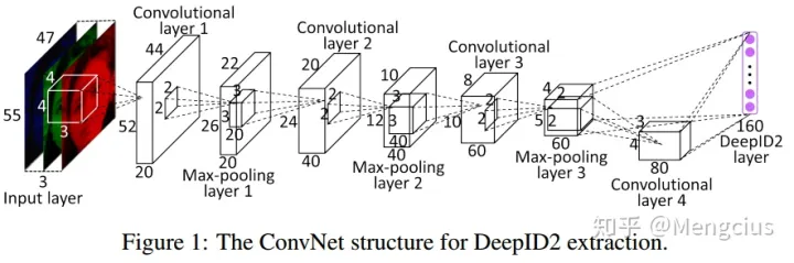 - DeepID2特征提取过程可表示为f=Conv(x,o),其中Conv(·)是由ConvNet定义的特征提取函数,x是输入人脸块,f是提取的DeepID2特征向量, θ_c表示要学习的ConvNet参数。