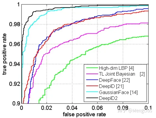 又进一步利用了大量patches的特征,进行了组合模型的加强,即在选取特征时进行了7次,第一次选效果最好的25个patch,第二次从剩余的patch中再选25个,以此类推;然后分别学习了7组特征的联合贝叶斯模型;最后通过进一步学习SVM融合了每对比较人脸的七个联合贝叶斯评分。通过这种方法实现了更高的99.15%的LFW人脸验证精度。LFW的ROC比较中DeepID2也最好。