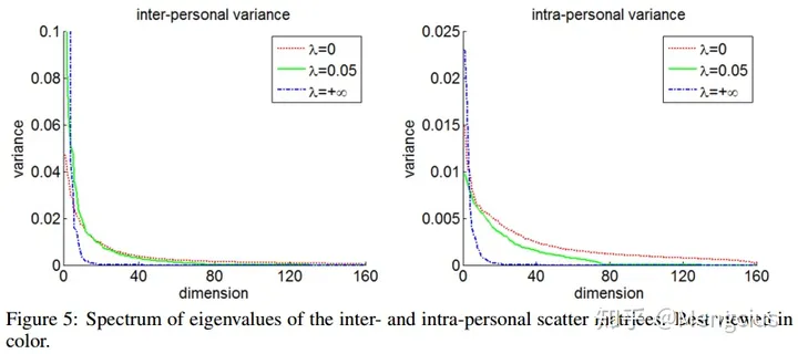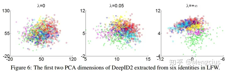 图6显示了前两个主成分分析维度的特性在λ下的变化,这些特征来自六个身份。当λ=0不同集群混合在一起;当λ=0.05类内差异显著降低和集群有了区分;当λ=无穷,虽然内在变化进一步减少,但集群明显重叠很难区分。
