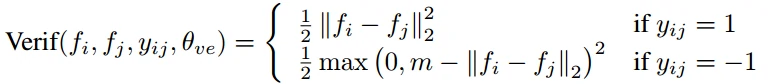 - fi和fj为两幅人脸特征向量,yij=1表示fi和fj来自相同身份,即最小化了两个向量之间的L2距离;yij−1是不同的身份,两距离需要大于m,θ_ve是用验证损失函数学到的参数。