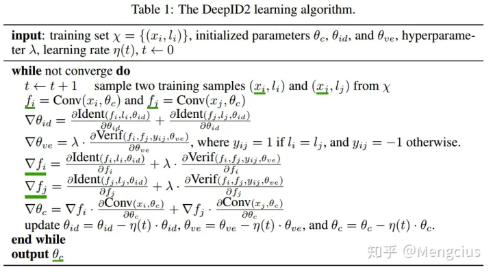 - 训练目标是在特征提取函数Conv(·)中学习参数θ_c,而θ_id和θ_ve仅是在训练期间传播identification和verification信号的参数。参数通过随机梯度下降来更新。