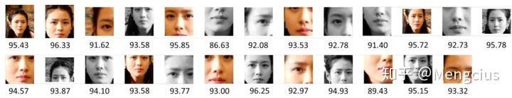 - 使用从每个块中提取特征的联合贝叶斯人脸验证准确度如图所示,可以看到放大的完整的人脸对齐图片准确率最高。