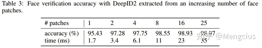 使用越来越多的人脸块中提取的DeepID2进行人脸验证的准确性也会越高,但速度会变慢。选择效果25个patches和180维DeepID2特征,在LFW上得到的最终准确率是98.97%,35ms(单颗Titan GPU)。