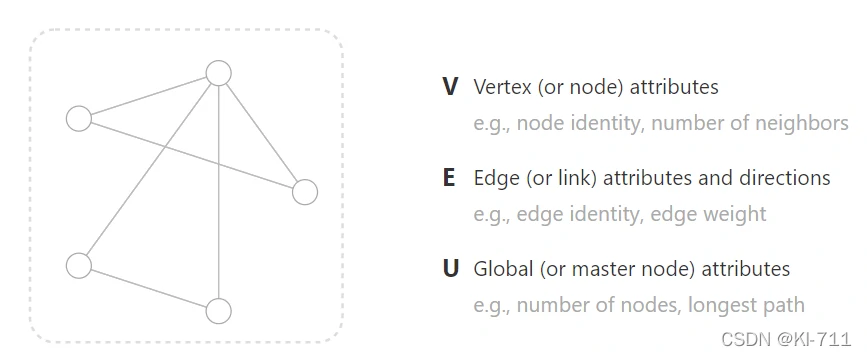 其中 V 表示顶点,E 表示边,U 表示全局(这个后面会有详细解释)。可以看到每一个定义后面都有一个attributes,这意味着我们不能只关注图的一个结构信息,还应该关注属性信息,比如节点的邻居数,边的权重,最长路径等等。