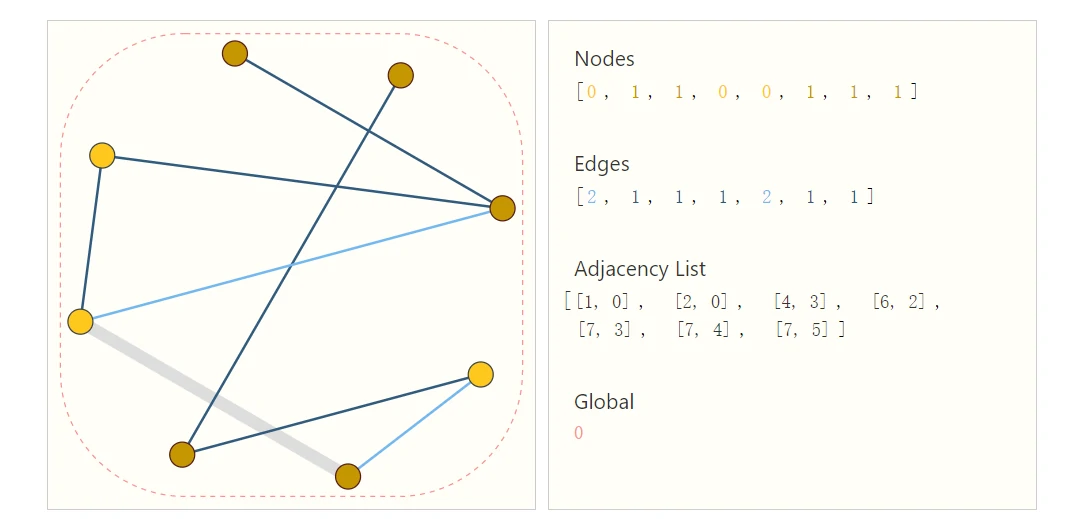 上图有8个顶点,7条边。对于每个顶点或者每条边的特征我们用一个标量(一般为向量)来表示,全局特征也用一个标量(一般为向量)来表示。对于连接性,不再用邻接矩阵来表示,而是用邻接列表来表示。