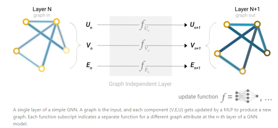 三个MLP组成了GNN的一层,经过GNN的一层后,原图的节点、边以及全局的状态向量都被更新过,但整个图的结构并没有发生变化。