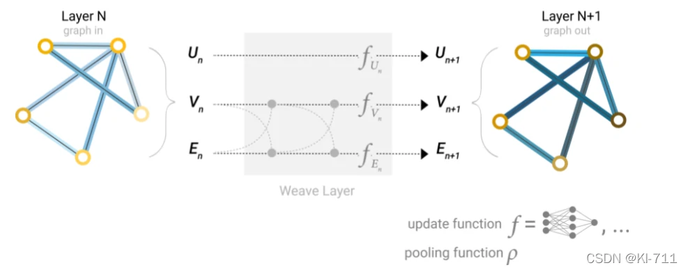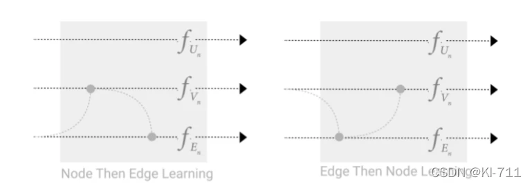 我们可以先把边的信息传递给顶点,顶点更新后,再将更新后的顶点信息传递给边,边再更新(上图左),或者相反(上图右)。