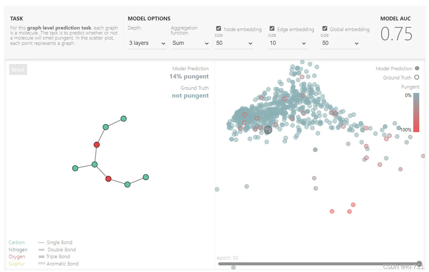 在这个演示框架中,我们可以选择的参数有:GNN的层数、Pooling方式(Mean、Sum或者Max)、节点的嵌入维度、边的嵌入维度以及全局的嵌入维度。