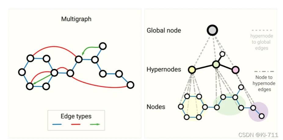 所谓多重图,就是指图中一对节点间可以有多种不同类型的边。比如在社交网络中,两个节点(用户)之间的边,可以表示这两人是熟人、家人或者情侣。这种情况下,GNN可以通过为不同类型的边设置不同类型的消息传递方式来进行调整。