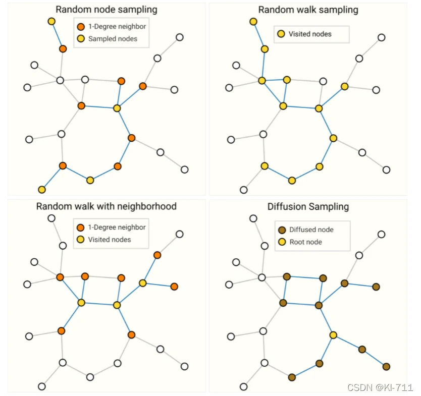 - Random walk sampling:做一些随机游走,从当前点的邻居节点中进行采样。