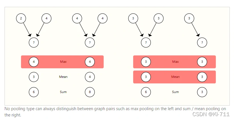 左边这幅图中,有2-4和4-4两个网络,如果我们采用max,二者结果都是4,没法进行区分,而mean和sum可以对二者进行区分;右边这幅图中,max和mean没法区分两种网络,而sum却可以。