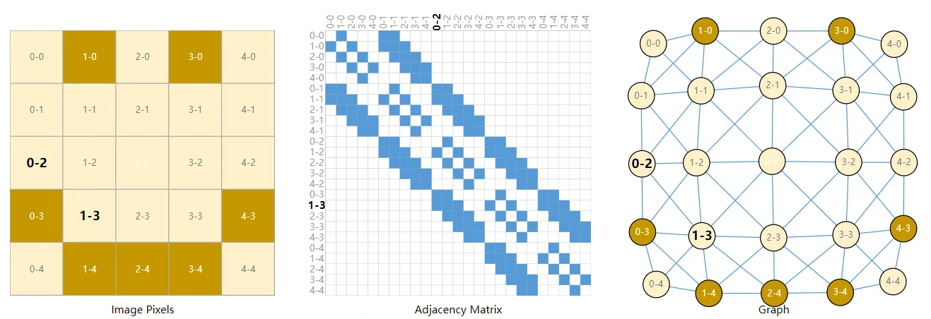 这里需要用到邻接矩阵A,假设我们以其中 25 × 25 个像素点为例: