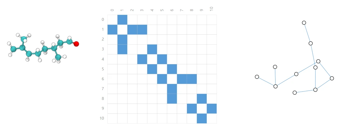 分子中原子通过作用力连在一起,因此每一个原子可以表示为一个点,原子间键表示为边。 如下图是一个香料分子: