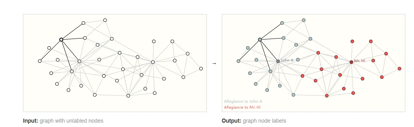 可以看到,每一个节点的标签要么为Mr. Hi,要么为Officer。在这种情况下,我们就可以建立一个模型对某一个节点的label进行预测。