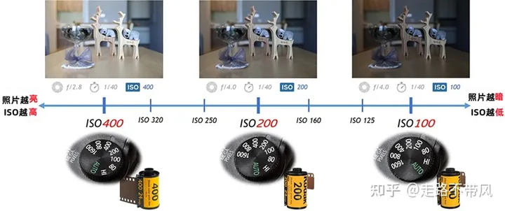 一般ISO Speed (简称ISO) 越高的胶片代表感光能力越好、ISO越低的胶片则是对光相较不敏感,而这概念也就一直沿用至今天的数位相机上。因此高ISO代表感光能力越高,照片越亮;反之亦然。