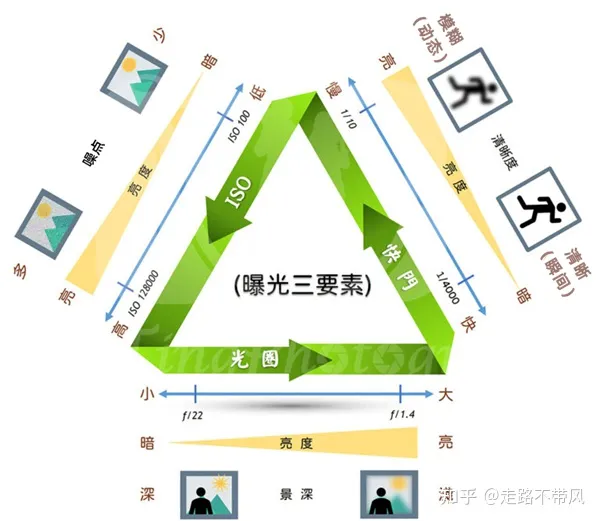 总结了上述的光圈、快门、ISO感光度可以得知,所谓的曝光三要素,其最根本的原理就是影响照片的亮度、照片的曝光度,且三者之间可通过彼此参数的调整来获得一致的曝光量。为了让大家能更快速理解本文,走路不带风特此整理了曝光三角的说明图,主要将上述所有内容浓缩于这张图中,希望对大家有所帮助。